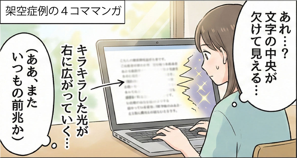 本漫画は片頭痛の前兆の典型的な経過を分かりやすく説明することを目的としたものであり、
