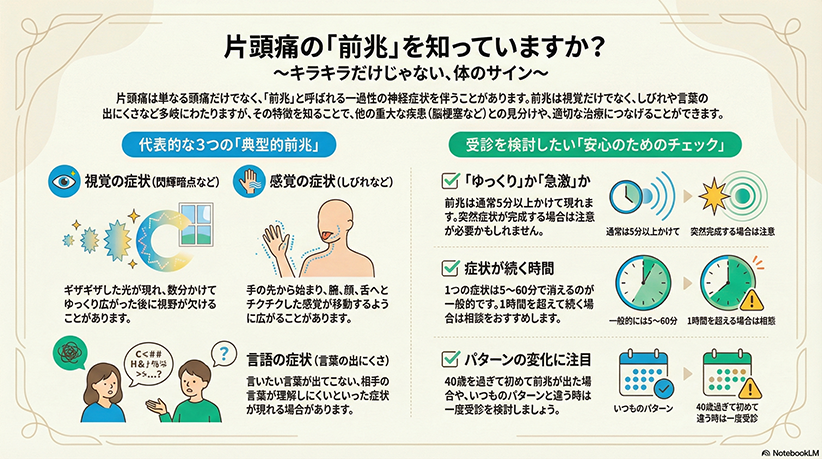 片頭痛の“前兆”は、決して「キラキラが見えるだけ」の症状ではありません。
